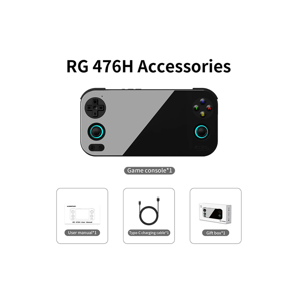 The ANBERNIC RG476H is a horizontal retro gaming handheld featuring a 4.7-inch, 1280x960 LTPS IPS display with a 120Hz refresh rate and 4:3 aspect ratio, ideal for classic games. It is powered by the UNISOC T820 processor, runs on Android 13, and includes ANBERNIC's AI assistant for features like real-time translation and walkthroughs. Other key features include dual-screen support for NDS/3DS titles via 1080p TV output, active cooling with a high-speed fan and heat pipe, and an all-glass full-screen design.